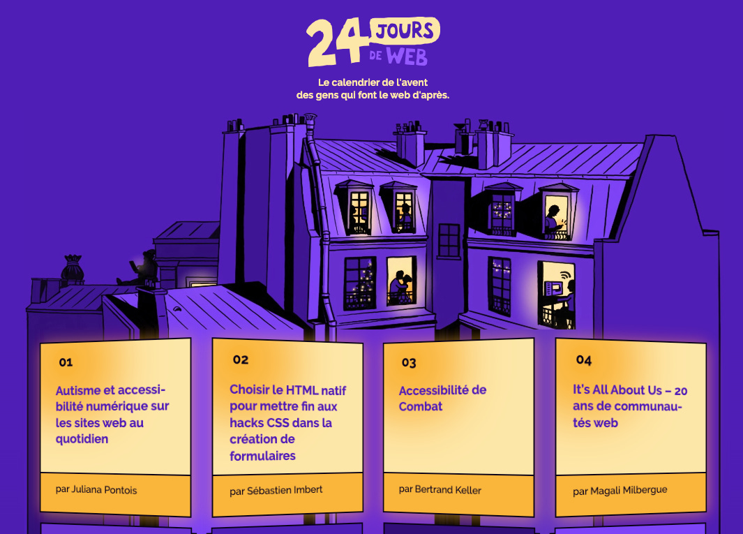 Ce calendrier proposĂ© par lâassociation Paris Web met en avant des articles Ă©crits par des auteurs aux profils variĂ©s et trĂšs diffĂ©rents les uns des autres. Ils y parlent du Web bien sĂ»r en partageant expĂ©riences, rĂ©flexions et tĂ©moignages. Sur les 4 premiers jours, on observe dĂ©jĂ deux articles consacrĂ©s Ă lâaccessibilitĂ© numĂ©rique. On a hĂąte de dĂ©couvrir les suivants đ