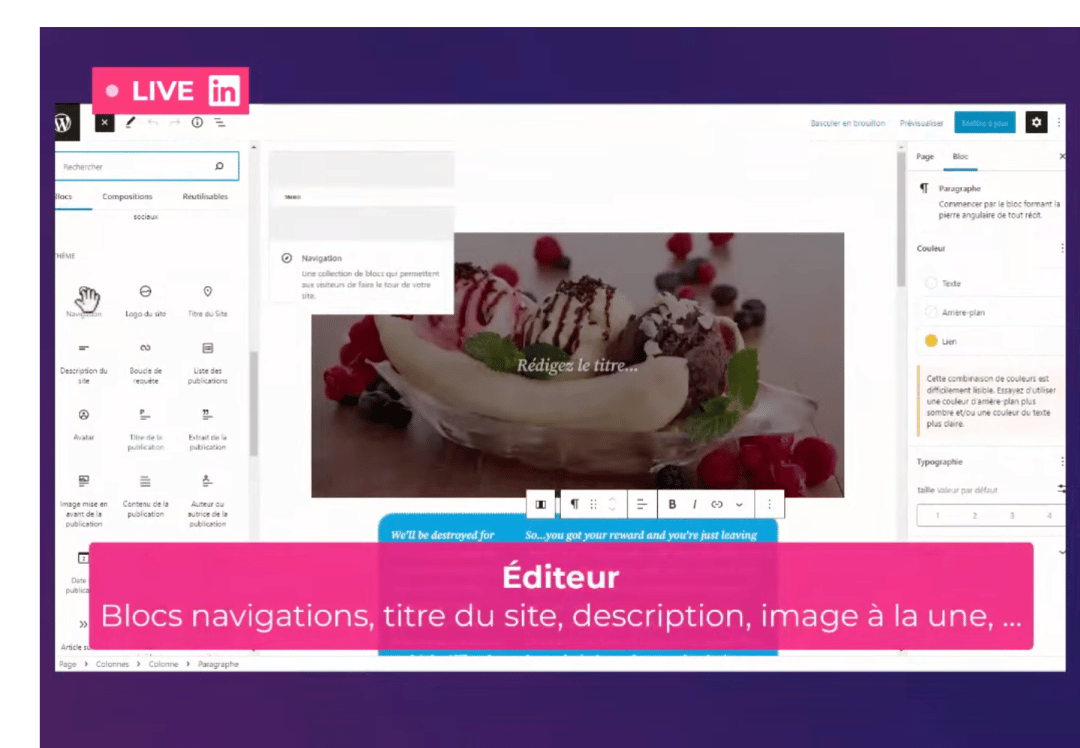 Pour rappel c’était l’éditeur de bloc donc l’édition de la zone de contenu d’une page, d’un article ou de n’importe quel type de publication avec des blocs.